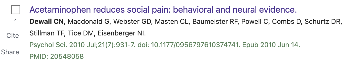 2. Dewall, C. N., Macdonald, G., Webster, G. D., Masten, C. L., Baumeister, R. F., Powell, C., Combs, D., Schurtz, D. R., 3. Stillman, T. F., Tice, D. M., & Eisenberger, N. I. (2010). Acetaminophen reduces social pain: Behavioral and neural evidence. Psychological Science, 21(7), 931–937. https://doi.org/10.1177/0956797610374741